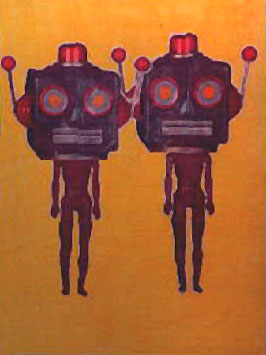 Katsu Oiwake created one of the first room-size installations at the Audart Gallery, for the "Salute to Broad Street" Exhibition. The work was based on dreams of his childhood in Japan. Digital prints of one of Oiwake's paintings - a portrait of an old woman (possibly representing his grandmother) - were lined up on shelves and illuminated like small lamps--the diffused light bathing the entire room in pink. Other paintings of dolls with robot heads; of Japanese candybars and other items reminiscent of Oiwake's childhood were included in the work. The floor was covered with many layers of styrofoam pebbles into which pathways were carved, allowing viewers to enter and explore Oiwake's dream. Katsu Oiwake is an intermedia artist. His interest in art and in music have led him to organize unique art events in New York nightclubs, as well as video screening events for expaceprojects. He was one of the organizers for "Heaven or Las Vegas: Deepdish", an art and music event at Limelight in New York. home artists' index............introduction |