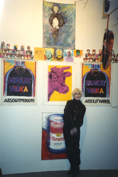 ALLEN MIDGETTE WITH SEVERAL OF HIS PAINTINGS AND MIXED MEDIA PIECES TEN YEARS AFTER: THE WARHOL FACTORY AT AUDART