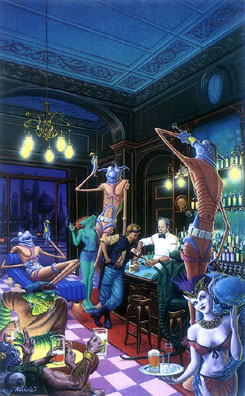James (Jamie) Warhola is the nephew of the late Andy Warhol. He participated in "Ten Years After: The Warhol Factory" at Audart in February of 1997, which marked the tenth anniversary of Andy Warhol's death. James Warhola, more than anyone, can create the most frightening creatures and have them appear completely non-threatening and ultimately cool. The aliens he includes in his numerous paintings of bars are larger than life (or smaller than life) and they are portrayed by Warhola as fun seekers. James is also an illustrator and author of children's books. His most recent offering is "Uncle Andy's" which draws on James' childhood memories of visiting Andy Warhol at his home in New York city. The book is published by Putnam and is available in bookstores everywhere. hhome.............artists' index ...........introduction |